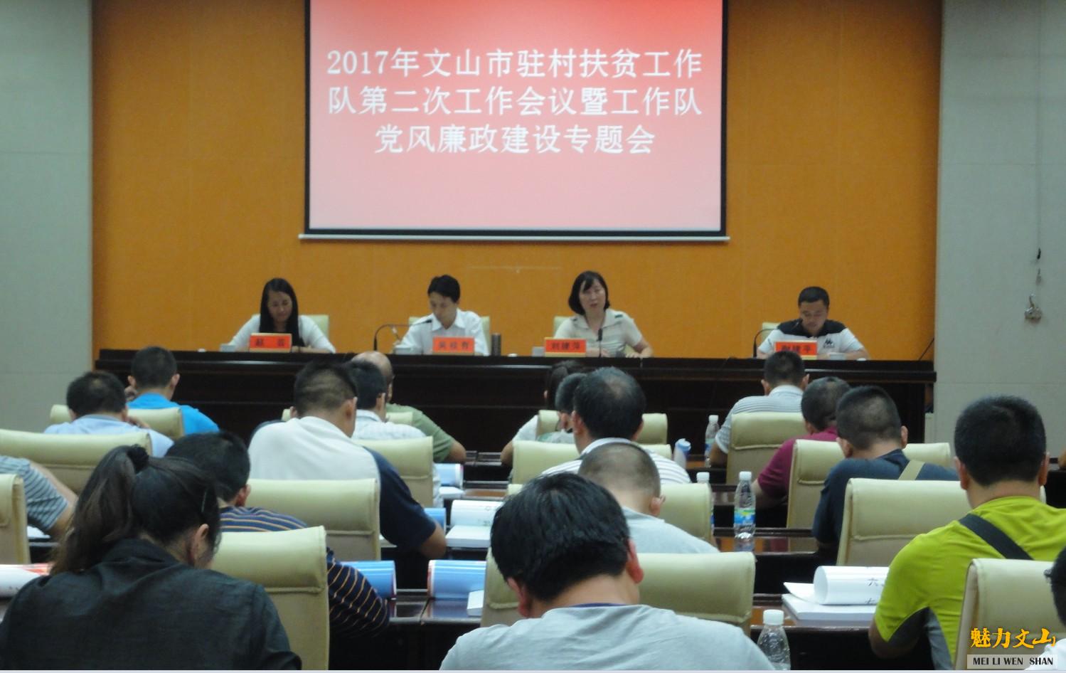6月27日晚上8点,文山市2017年第二次工作队暨党风廉政建设工作会议在市会务中心一楼视频会议室召开,会议由文山市驻村扶贫工作队吴桂有副总队长主持,市委副书记、工作队总队长刘建萍、市委组织部、市扶贫局主要领导参加会议。